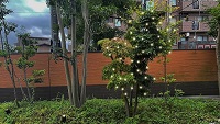 デニーズ調布店、植物の成長エネルギーで点灯する「ボタニカルライト」を中庭に常設化