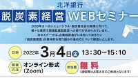【北海道電力】 株式会社北洋銀行の主催で、「脱炭素経営WEBセミナー」が開催されます。 同セミナーでは、2050年カーボンニュートラル...